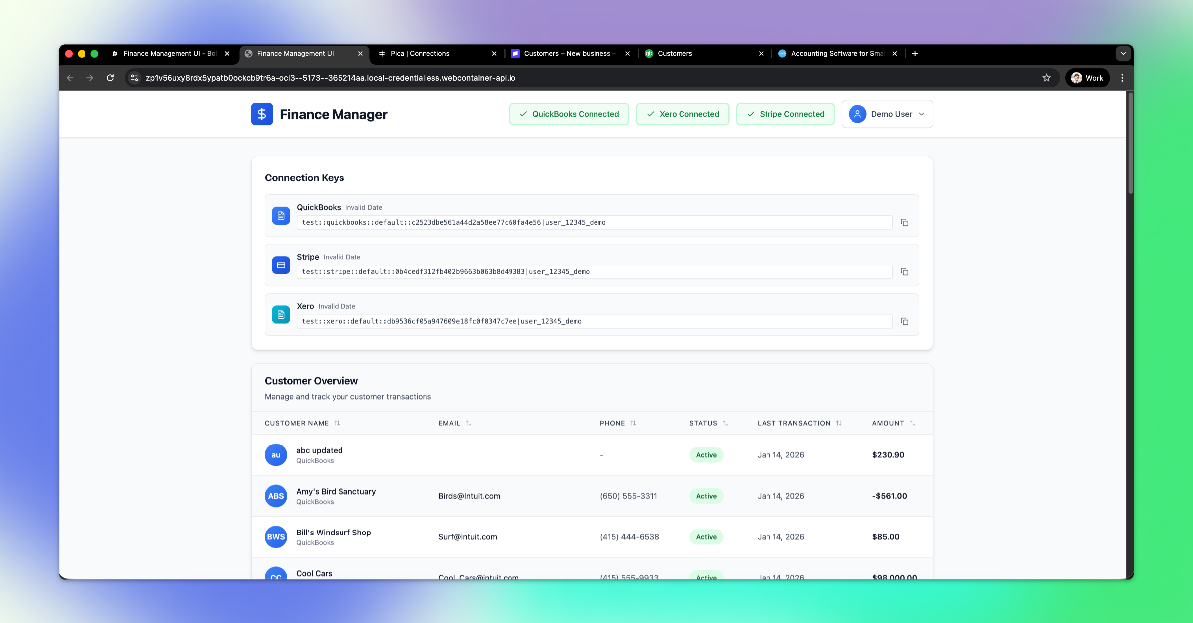 Congratulations! ๐ You've just built a multi-tenant finance management app that lets your users connect their own QuickBooks, Xero, and Stripe accounts. This is a powerful pattern for building SaaS applications that need to integrate with your users' existing tools.